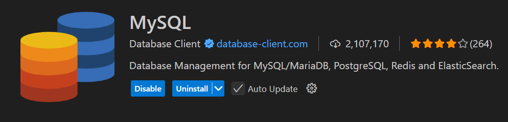 먼저 VS Code의 확장 프로그램(Extensions)에서 MySQL을 검색하여 설치합니다. 저는 MySQL by cweijan 확장을 사용했습니다. 설치 후 좌측 Activity Bar에 데이터베이스 아이콘이 생깁니다.